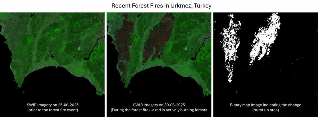 SWIR imagery highlights active fires (red) and a binary map quantifies the burnt area, demonstrating rapid satellite-based monitoring.